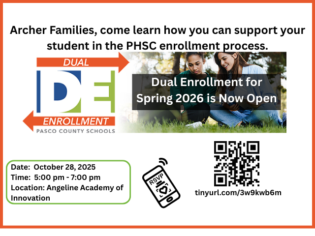 We will have a session on Dual Enrollment for Archer families on Tuesday, October 28, from 5 – 7 pm.. You will learn the requirements and how your student will register for Dual Enrollment classes. Sign up for this very helpful presentation using our RSVP form.